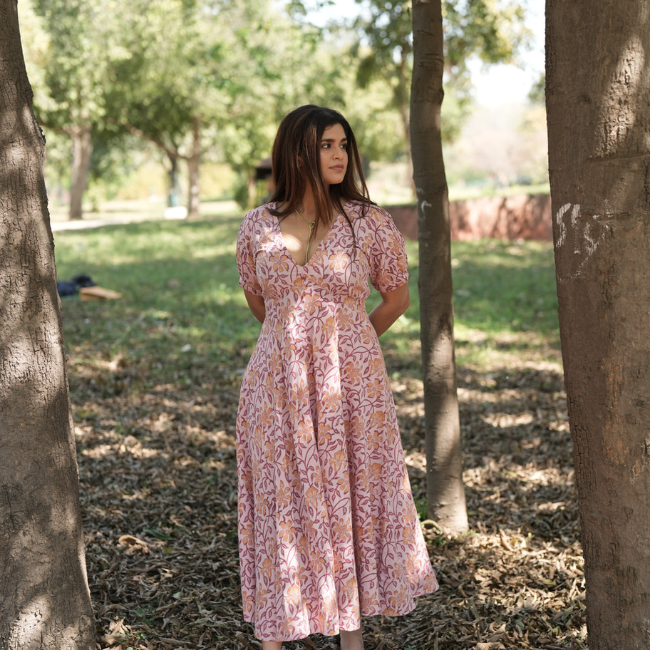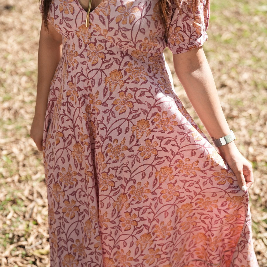 The soft, dusty pink fabric is adorned with an intricate hand block print of winding floral vines in shades of golden-orange and deep burgundy. With its puffed sleeves and floor-sweeping length, it’s the quintessential dress for garden events, afternoon soirées, or any occasion where you want to feel both elegant and relaxed.